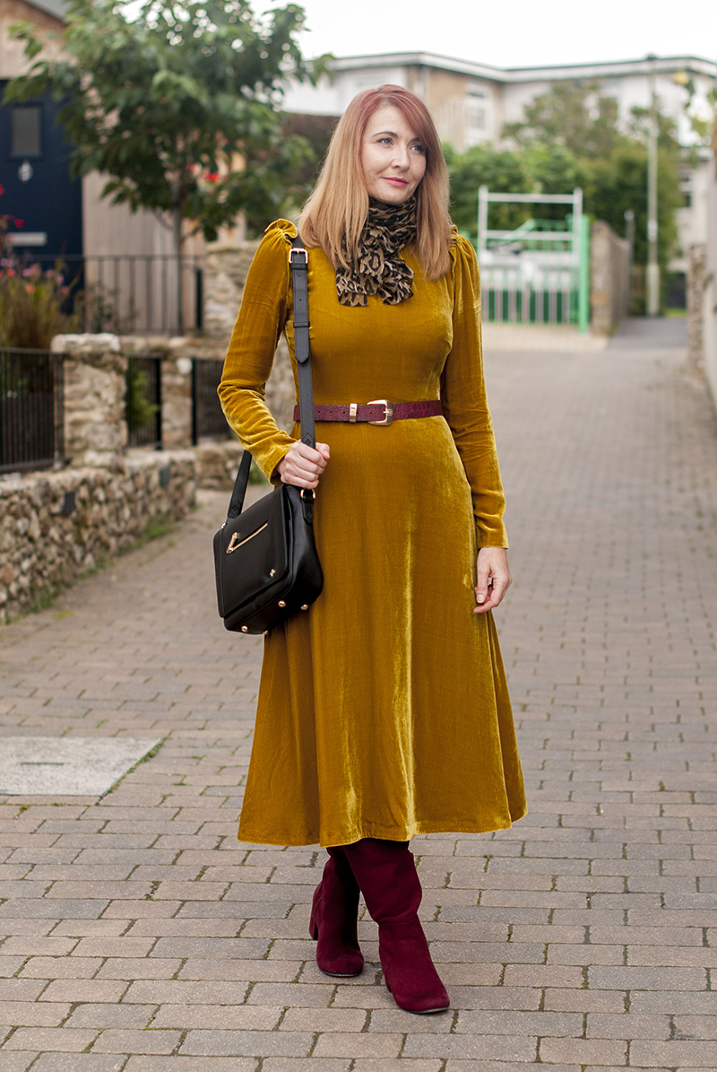 Catherine from NotDressedAsLamb paired her velvet midi dress with boots for work, revealing on trend fishnets for dinner.
