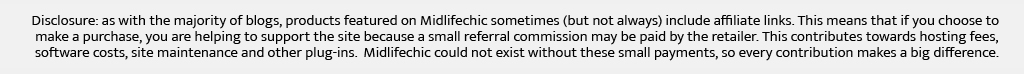 Disclosure: as with the majority of blogs, products featured on Midlifechic sometimes (but not always) include affiliate links. This means that if you choose to make a purchase, you are helping to support the site because a small referral commission may be paid. This contributes towards hosting fees, software costs, site maintenance and other plug-ins. Midlifechic could not exist without these small payments, so every contribution makes a big difference.