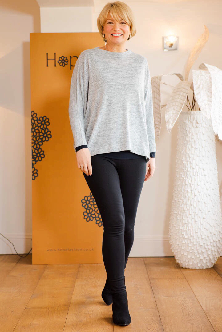 I’m starting with the new foundation roll neck in silver grey which is a really flattering colour. As you know, the Hope concept starts with the foundation pieces which are made from a specially developed breathable fabric that keeps you cool in the Summer and warm in the Winter.