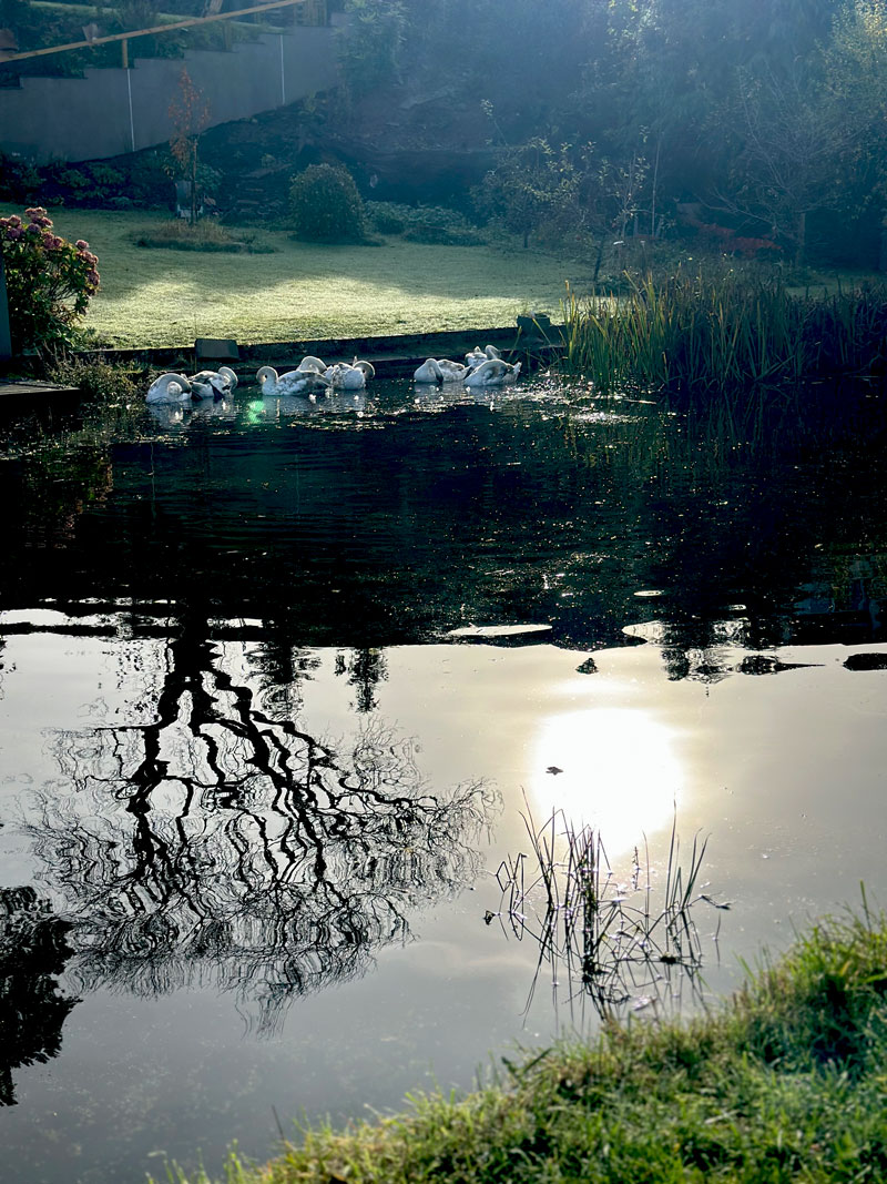 They made me think of this photo that I took on a frosty morning a couple of weeks ago with Christmas in mind – seven swans a-swimming. I've been watching these cygnets since they were born back in the spring. Originally there were nine, the most we've ever had in 21 years of living on the canal and they've survived all summer long. Two have now fledged but these seven are still hanging around their mum and dad. Any day now he'll chase them off but they aren't in a rush to go… and I can hear Mal in my ear muttering that young adult swans have a lot in common with the young adult humans of 2025!